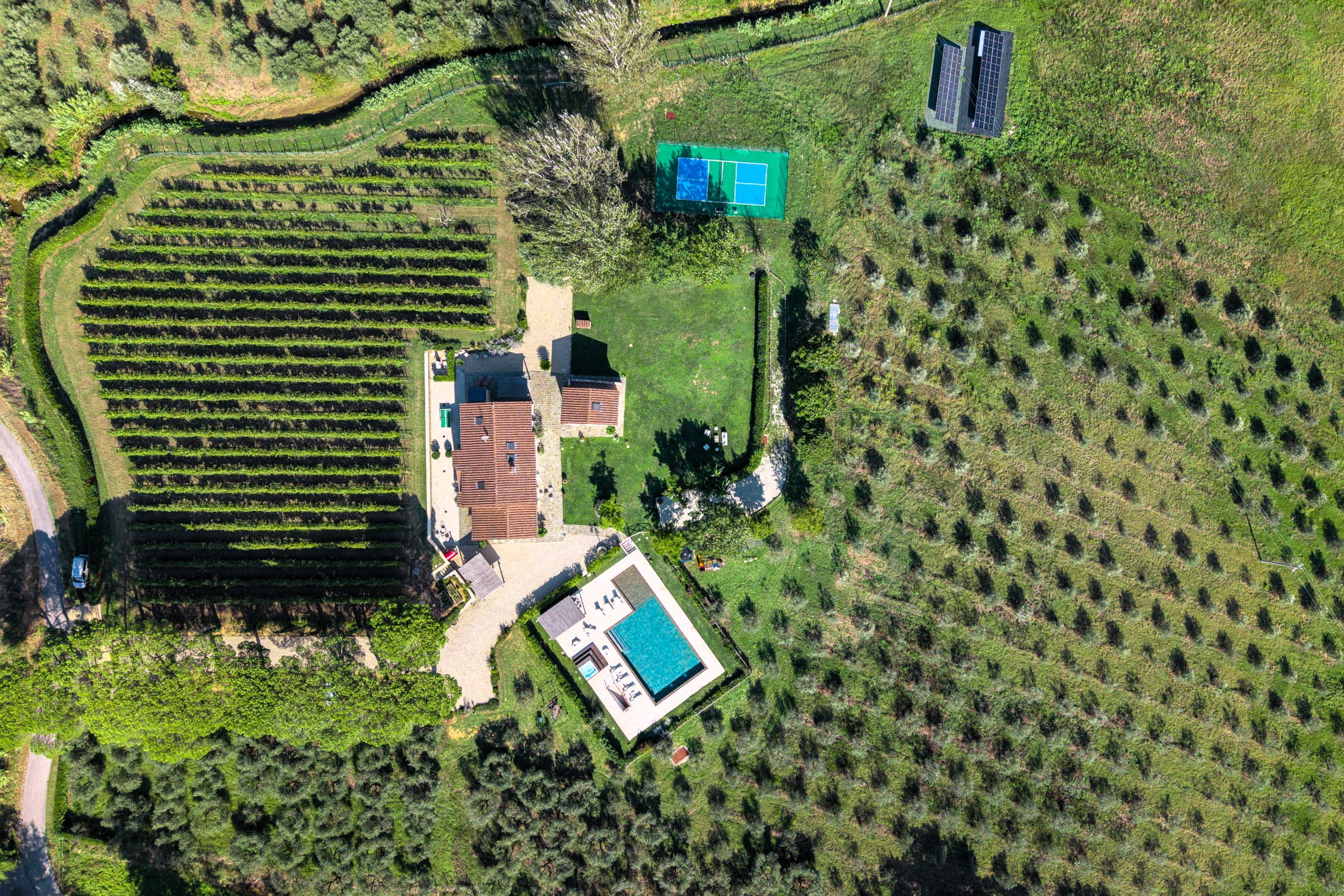 Deux bâtiments (villa principale et dépendance) peuvent accueillir jusqu'à 12 adultes et 4 enfants. La villa comprend 6 chambres doubles avec salle de bain privative, dont deux suites parentales de 25 m².