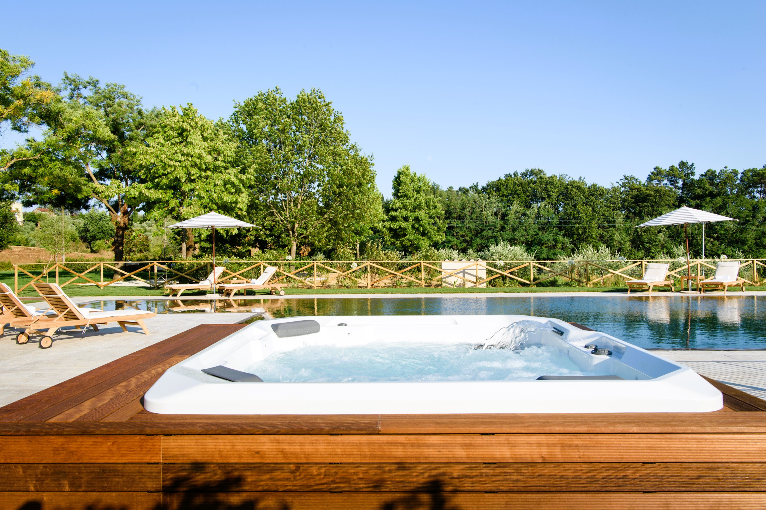 Une superbe piscine (1,40 m de profondeur maximum) avec escalier, toboggan et hydromassage intégré est à votre disposition. À côté, une cuisine d'été entièrement équipée de 120 m² comprend un coin repas et des espaces de rangement.