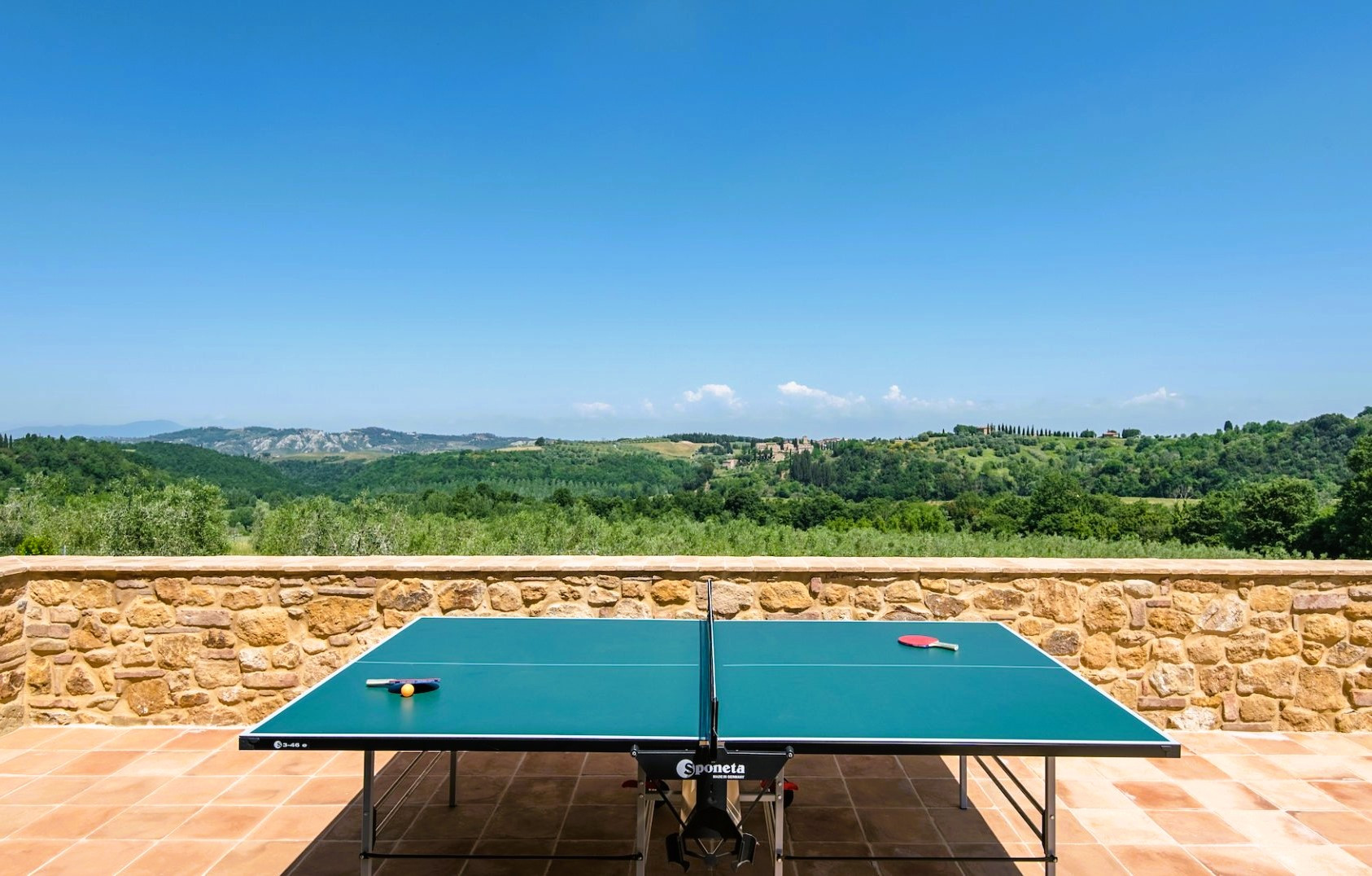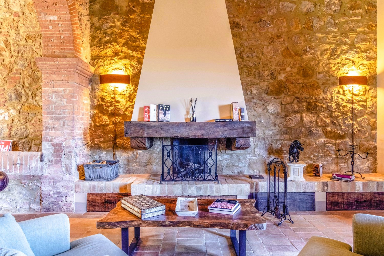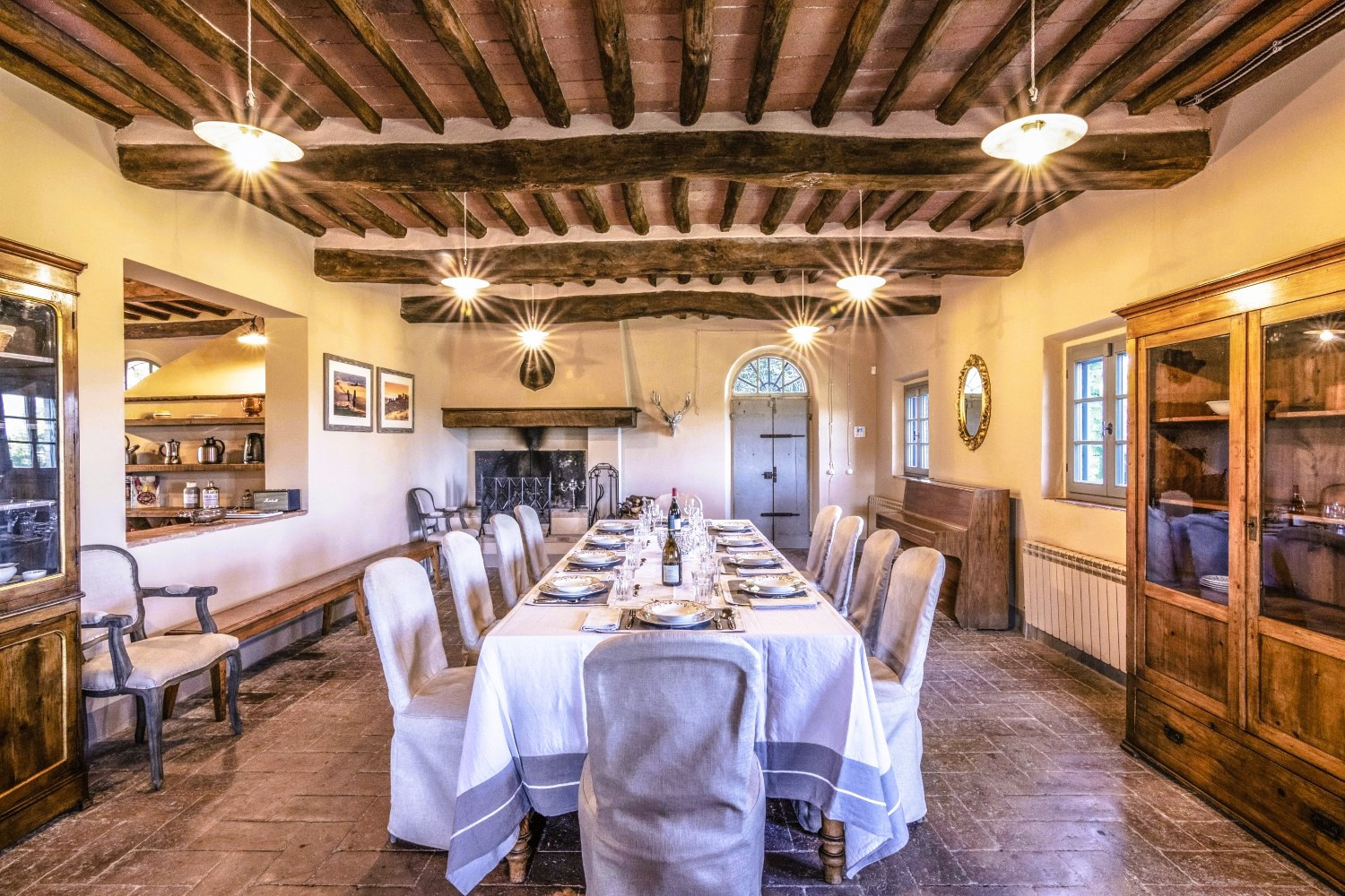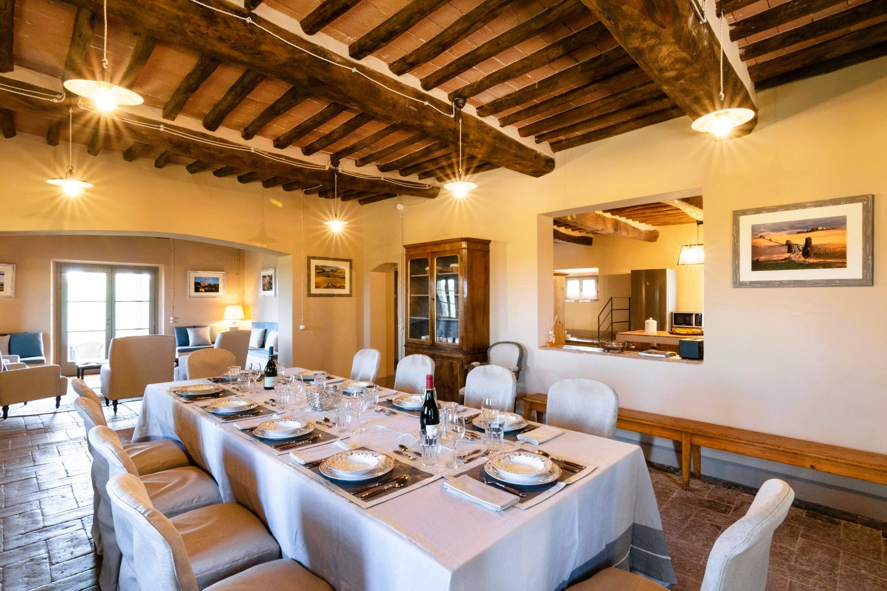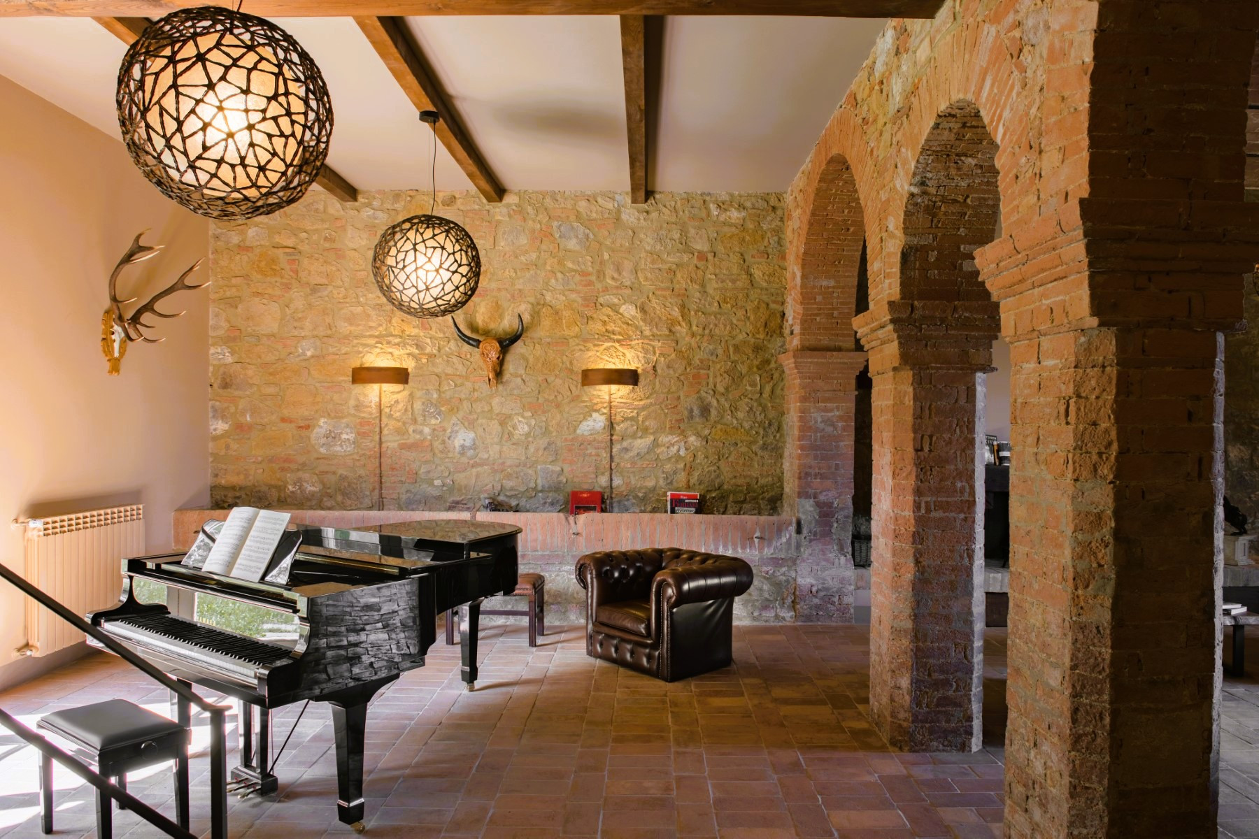 De woning combineert naadloos hedendaagse luxe met klassieke architectonische details, zoals traditionele terracotta tegels, zichtbare houten balken, stenen open haarden en op maat gemaakt meubilair.