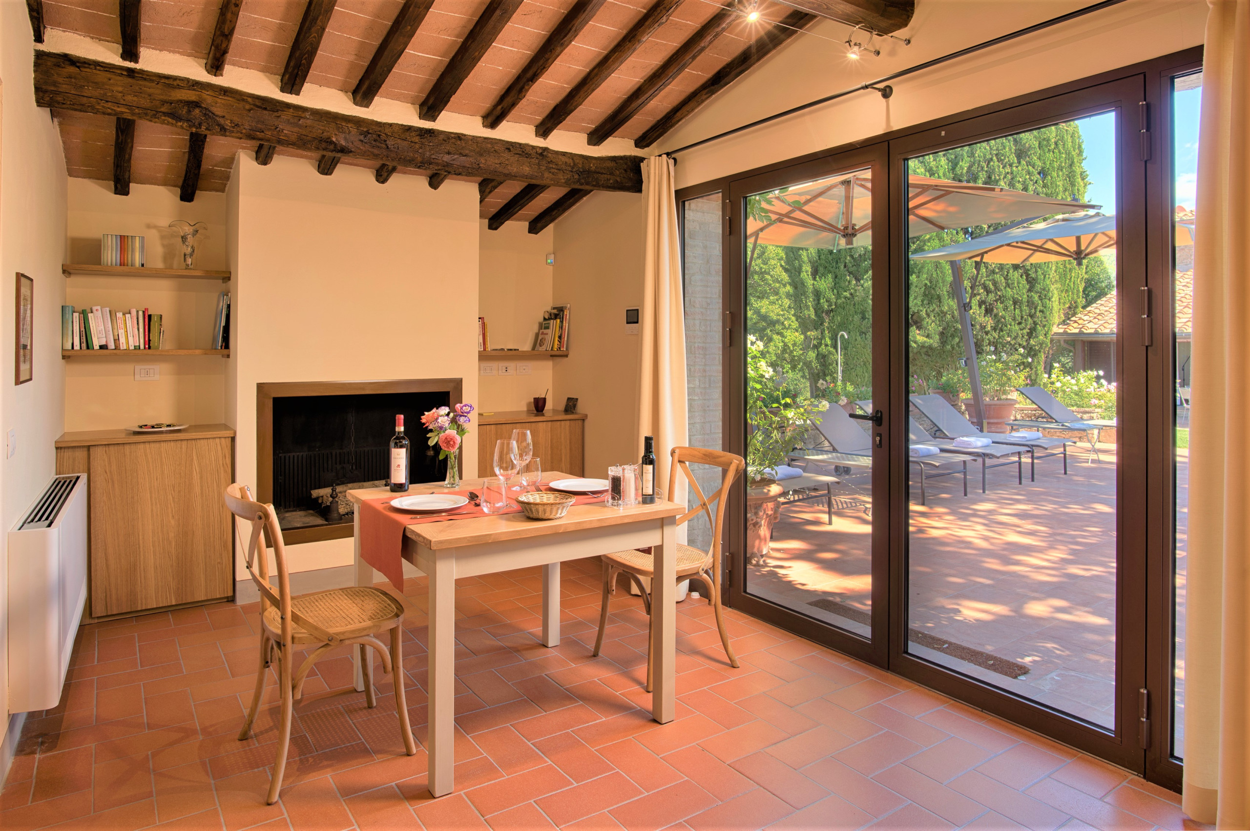 Net zo indrukwekkend als het interieur zijn de buitenruimtes met adembenemend uitzicht op de oude, traditionele terrassen van de wijngaard van Antico Podere.